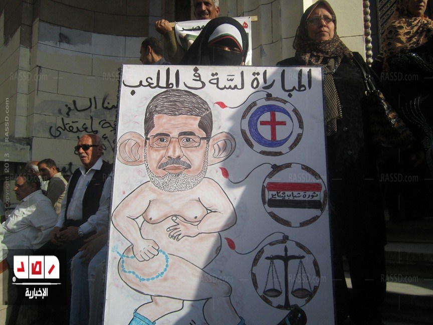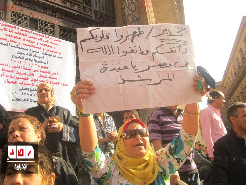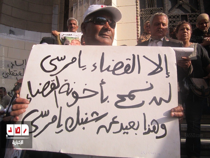 كما رفعوا لافتات مكتوب عليها"لن نسمح بأخونة القضاء"و"طول ما الدم المصرى رخيص يسقط يسقط اى رئيس"و"يا قضاة يا شرفاء خلصونا من الطغاة".
