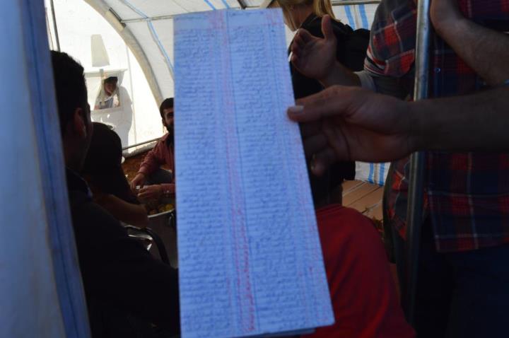 صادف وجودنا في المخيم وقت توزيع وجبة الغداء، أخذ المصطفون في انتظار الحصول على نصيبهم، يشتكون لنا في صوت واحد من ضآلة الوجبة الموزعة. أرانا "أبو محمد"، أحد المشرفين على توزيع الطعام القائمة الطويلة للأسماء التي تنتظر دورها لاستلام وجبتها، في حين أخذ رفاقه في الإشارة إلى الوجبات الموزعة، من حق كل شخص في المخيم ربع رغيف "لحم عجين" وحبة بطاطا مسلوقة، هذا كل شيء لذاك اليوم. عندما التقينا مع مدير المخيم "حسام شمو" أخبرنا بوجود حوالي 14 ألف شخص في المخيم، في حين أن الوجبات التي تقدمها الهيئات الخيرية للمخيم، تكفي 9 آلاف شخص فقط، وهكذا يكون على مشرفي المخيم تقليل حصة الأفراد، لكي يتمكن الجميع من الحصول على ما يأكلونه.
