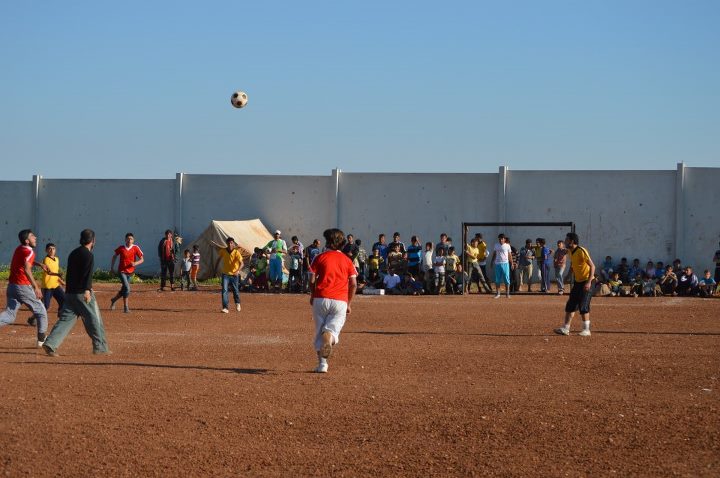 تنامت إلى أسماعنا هتافات تنادي بالحرية، وبما أن اليوم كان الجمعة، اعتقدنا أنها أصوات مظاهرة تنظم في المخيم، ولكن عندما وصلنا لمصدر الأصوات وجدنا مجموعة من الشباب تلعب كرة القدم، وحولهم أعداد كبيرة من المشجعين، وبدا فريق "الحرية" متقدما على فريق "الاتحاد" لذا تعالت الأصوات بتشجيعه. أخبرنا مرافقنا "أحمد" أن مسابقات كرة القدم تنظم بشكل دائم في المخيم، فالشباب "يلعبوا كي ينسوا".