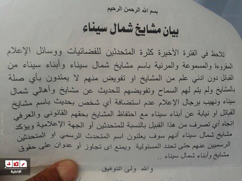 وأشار المشايخ إلى" أنه لوحظ في الفترة الأخيرة كثرة المتحدثين للفضائيات، ووسائل الإعلام المقروءة، والمسموعة، والمرئية باسم مشايخ سيناء، وأبناء سيناء من القبائل دون أدني علم من المشايخ أو تفويضا منهم" .