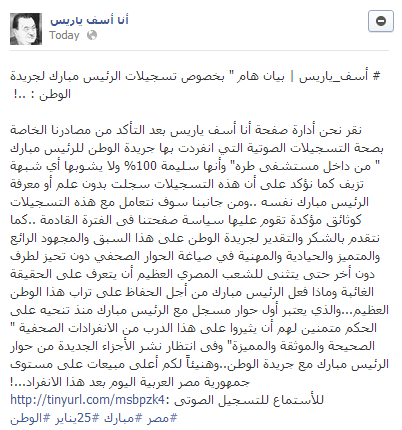 أكدت صفحة " أنا آسف يا ريس " علي موقع "الفيسبوك" صحة التسجيلات الصوتية التي نشرتها صحيفة الوطن قائلة : " نقر نحن أدارة صفحة أنا أسف يا ريس بعد التأكد من مصادرنا الخاصة بصحة التسجيلات الصوتية التي انفردت بها جريدة الوطن للرئيس مبارك " من داخل مستشفى طره" وأنها سليمة 100% ولا يشوبها أي شبهة تزيف " .