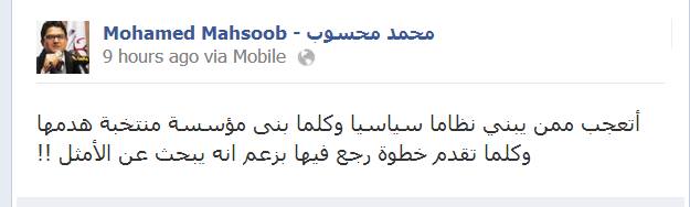 وقال محسوب – من خلال تدوينه له على موقع التواصل الاجتماعي " فيس بوك " صباح اليوم(الخميس) : " أتعجب من سياسيين اسقطوا طاغية بثورة سلمية ثم لما جاءهم رئيس منتخب اختلفوا ودقوا طبول الحرب " .