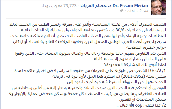 وتعقيبا على قوله أن المشاركة ستكون محدودة في يوم 30/6 ذكر أن من أسباب ذلك أن "هذا الشعب صبر طويلا على الحرمان من حقوقه السياسية فى اختيار حاكمه لمدة ستين سنة (1952-2011) ثم استرد هذا الحق ﻷول مرة فى تاريخه الحديث،فهل من السهولة أن يفرط فيه مرة أخرى ليعود إلى الفوضى أو لتتحكم فيه النخب التى ضيعت البﻻد واحتقرته وتنظر إليه من أعلى وتخاطبه من الفنادق الفاخرة،بينما يصلى مع رئيسه المنتخب كل جمعة ويسكن معه فى عمارة باﻹيجار وﻻ يسكن المنتجعات أو القصور".