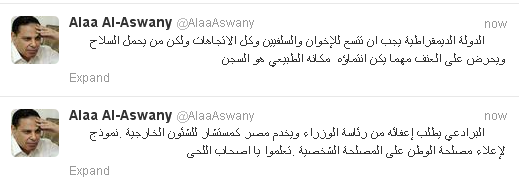 قال الكاتب علاء الأسوانى إن الدكتور محمد البرادعي طلب إعفائه من رئاسة الوزراء وعرض أن يخدم مصر كمستشار للشئون الخارجية