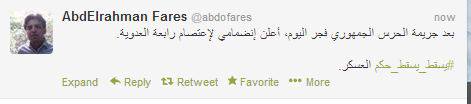 أما عبد الرحمن فارس، أحد مؤسسي التيار المصري، فأعلن على تويتر انضمامه ﻹعتصام رابعة العدوية. بعد جريمة الحرس الجمهوري فجر اليوم.
