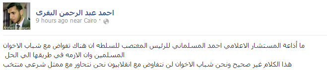 وقال البقري، في تدوينة له على موقع التواصل الاجتماعي "فيس بوك": " ما أذاعه المستشار الإعلامي أحمد المسلماني للرئيس المغتصب للسلطة أن هناك تفاوضاً مع شباب الاخوان المسلمين وأن الأزمة في طريقها الي الحل..هذا الكلام غير صحيح ونحن شباب الاخوان لن نتفاوض مع انقلابيون نحن نتحاور مع ممثل شرعي منتخب"