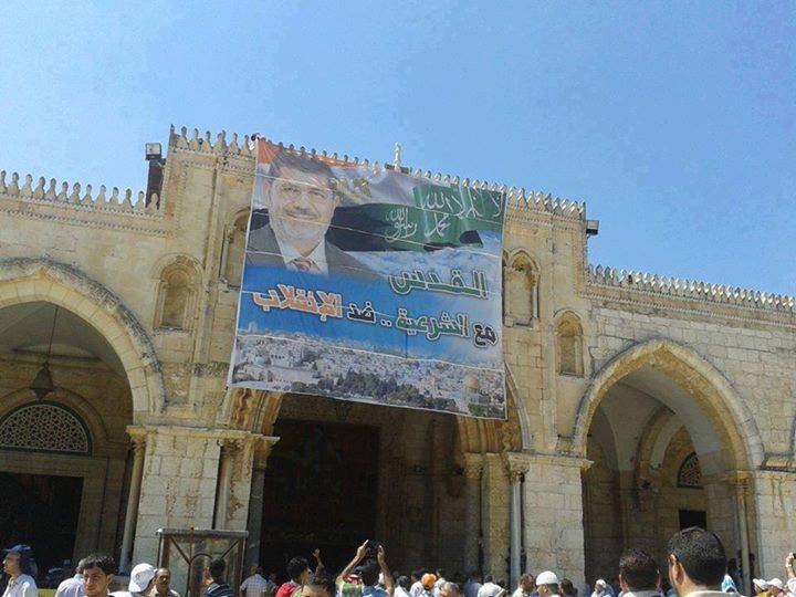 كما علقت لافتة باحدى ساحات المسجد الأقصى بفلسطين تضامنا مع الرئيس كتب عليها " القدس مع الشرعية ..ضد الانقلاب"