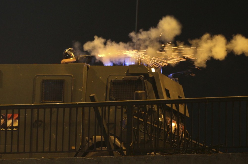 أحد أفراد قوات الأمن التابعة لوزارة الداخلية أثناء إطلاق القنابل المسيلة للدموع على المتظاهرين المعارضين للانقلاب العسكري بميدان رمسيس منذ قليل، ويظهر في الصورة ملصق على المدرعة مكتوب عليه "أمنكم مهمتنا وسلامتكم غايتنا"
