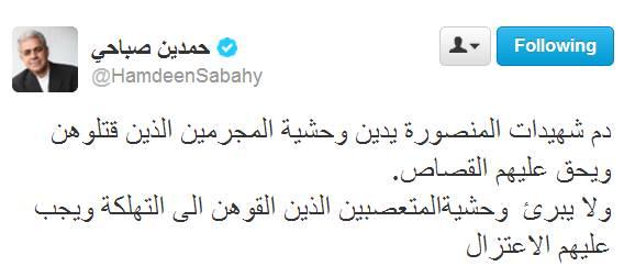 وقال المرشح الرئاسي السابق، في تدوينة له على موقع التواصل الاجتماعي «تويتر»: «دم شهيدات المنصورة يدين وحشية المجرمين الذين قتلوهم ويحق عليهم القصاص ولا يبريء وحشية المتعصبين الذين ألقوهن إلى التهلكة ويجب عليهم الاعتزال».