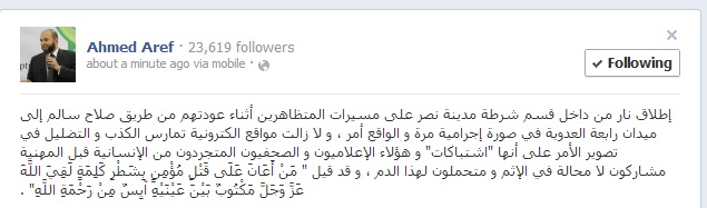 واضاف عارف عبر صفحته علي موقع التواصل الاجتماعي فيس بوك –اليوم الثلاثاء- أنه ما زالت مواقع الكترونية تمارس الكذب و التضليل في تصوير الأمر على أنها "اشتباكات" و هؤلاء الإعلاميون و الصحفيون المتجردون من الإنسانية قبل المهنية مشاركون لا محالة في الإثم و متحملون لهذا الدم ، و قد قيل " مَنْ أَعَانَ عَلَى قَتْلِ مُؤْمِنٍ بِشَطْرِ كَلِمَةٍ لَقِيَ اللَّهَ عَزَّ وَجَلَّ مَكْتُوبٌ بَيْنَ عَيْنَيْهِ آيِسٌ مِنْ رَحْمَةِ اللَّهِ" .