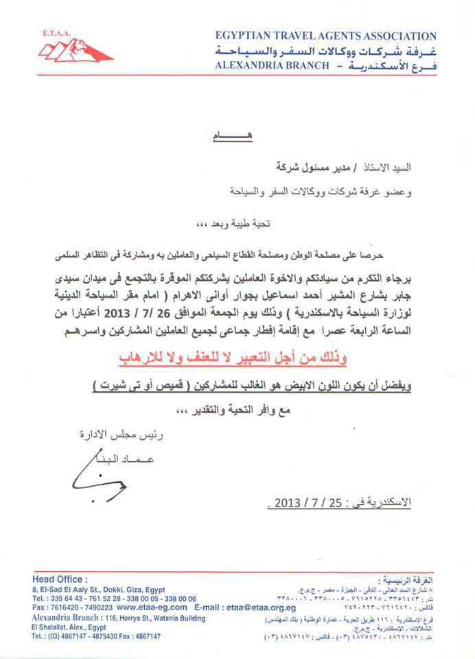 وقال الخطاب الذي حصلت شبكة رصد على نسخة منه " حرصا على مصلحة الوطن و مصلحة القطاع السياحى و العاملين به و مشاركة في التظاهر السلمي ، برجاء التكرم من سيادتكم و الاخوة العاملين بشركتكم الموقرة بالتجمع في ميدان سيدى جابر بشارع المشير احمد اسماعيل بجوار اواني الاهرام امام مقر السياحة الدينية بوزارة السياحة بالاسكندرية و ذلك يوم الجمعة 26 – 7 -3013 اعتبارا من الساعة الرابعة عصرا مع افطار جماعى لجميع العاملين بالشركة و ذلك من أجل التعبير لا للعنف لا للارهاب".
