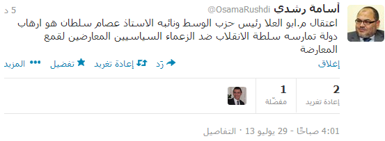 أكد أسامة رشدي – المستشار السياسي لحزب البناء والتنمية – اليوم (الخميس) أن اعتقال كلا من المهندس أبو العلا ماضي، رئيس حزب الوسط، ونائبه عصام سلطان هو بمثابة إرهاب دولة تمارس سلطة الانقلاب ضد الزعماء السياسيين المعارضين لقمع المعارضة.