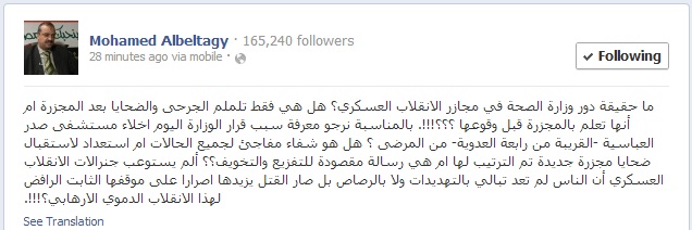 وأضاف البلتاجي، عبر صفحته علي موقع التواصل الإجتماعي "فيس بوك" اليوم الثلاثاء، متسائلاً :"ما حقيقة دور وزارة الصحة في مجازر الانقلاب العسكري؟ هل هي فقط تلملم الجرحى والضحايا بعد المجزرة ام أنها تعلم بالمجزرة قبل وقوعها؟"..