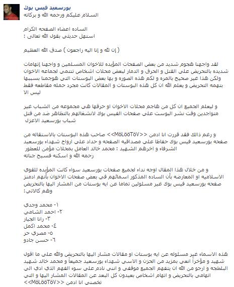 مقتل محمد دفع أدمن صفحة "بورسعيد فيسبوك" لترك الصفحة  بعد خطاب الصفحة المحرض  علي قتل الإسلاميين ودعوته الاعضاء بكتابة اسماء الإخوان في بورسعيد وكذلك محلات أصحاب التيار الإسلامي وهو ما اعتبرته هدد من الصفحات الإسلامية تحريض صريح.