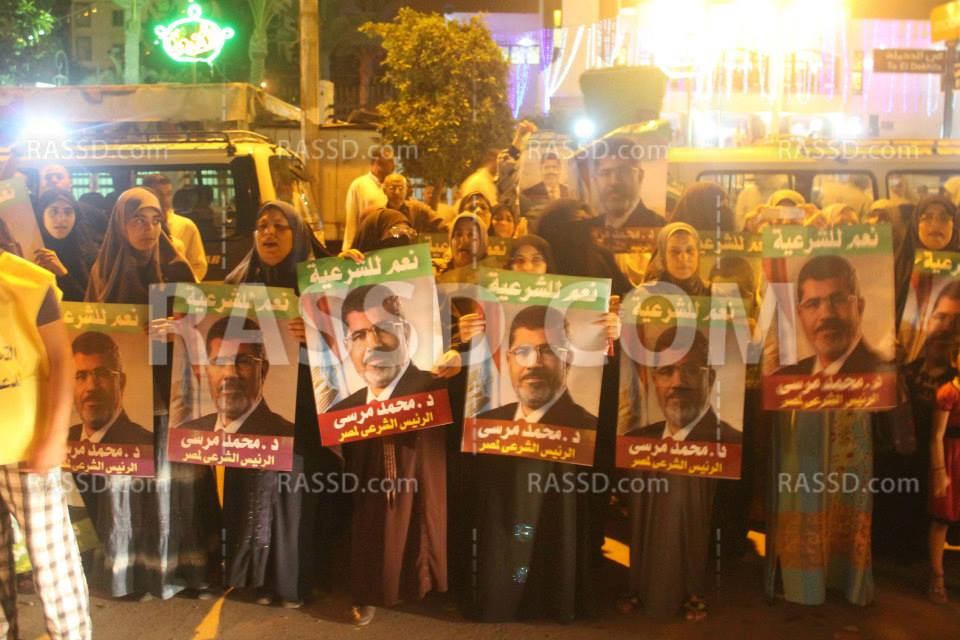 فيما ردد المتظاهرون هتافات ضد السيسي والانقلاب العسكرى ومؤيدة للرئيس مرسي وللشرعيه مثل ( سيسي سيسي سيسي ليه مصر معسكر ولا ايه .. يسقط يسقط حكم العسكر مصر دولة مش معسكر … سيسي يا سيسي ياسيسي المرسي هو رئيسى … ارفع صوتك قولها قويه مرسي رئيس ومعاه شرعيه)