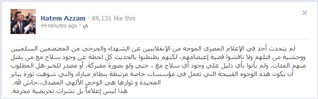 وتسأئل عزام، هل المطلوب أن يكون هذة الوجوه القبيحة التي تعمل في مؤسسات خاصة مرتبطة بنظام مبارك والتي شوهت ثورة يناير المجيدة و ثوارها هي الوحي الآلهي المصدق ..حاش لله"، مضيفا" هذا ليس إعلاماً بل نشرات تحريضية مجرمة".