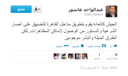 و استنكر عبد الواحد عاشور،مدير تحرير الشرق الاوسط، اليوم تطويق الجيش لمداخل القاهرة من أجل التضييق على أنصار الشرعية والدستور ومنعهم من الوصول لأماكن المظاهرات، مشيرًا إلي أن الطرق البديلة ستفلح في إجهاض ذلك.