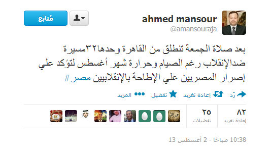 ومن جانبه، أشار الاعلامي أحمد منصور، عبر تويتر، إلي انطلاق ٣٢مسيرة ضدالإنقلاب من القاهرة عقب صلاة الجمعة، للتأكيد على رفض المصريين للانقلاب العسكري.