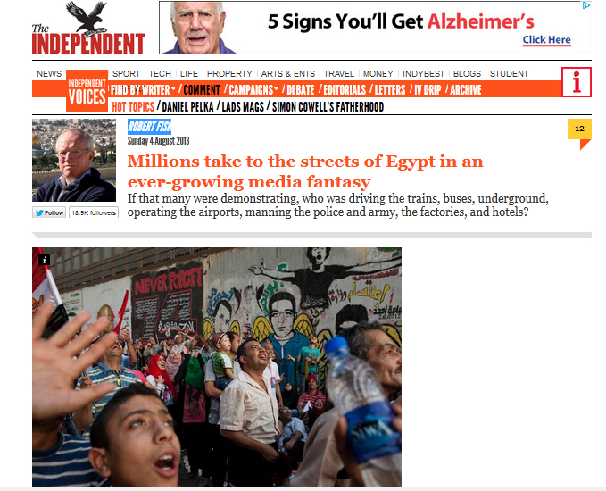 وتابع فيسك قائلاً: إن الأوهام التي تحاول وسائل الإعلام المصرية بثها في أذهان الشعب المصري المتابع لها لم تقتصر فقط على محاولتهم لتأكيد فكرة الطبيعة الإرهابية لجماعةالإخوان وعدم ديمقراطيتهم، ولكنهم لعبوا بشكل رئيسي على تغذية أحلام العالم من حولهم وخداعه بالترويج لخروج الملايين في الشوارع للإطاحة بمرسي، حتى يكون ذلك مبرراً للسيسي لإسقاطه لمجرد اتباعه لإرادة الشعب.