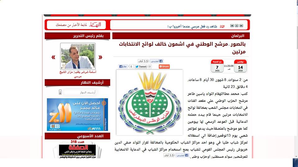 ترشح " طاهر" علي قوائم الحزب الوطني المنحل في انتخابات 2010 ولم يلاقي بها أي تأييد شعبي بالإضافة إلي أنه تعمد مخالفه قانون الانتخابات أكثر من مره .