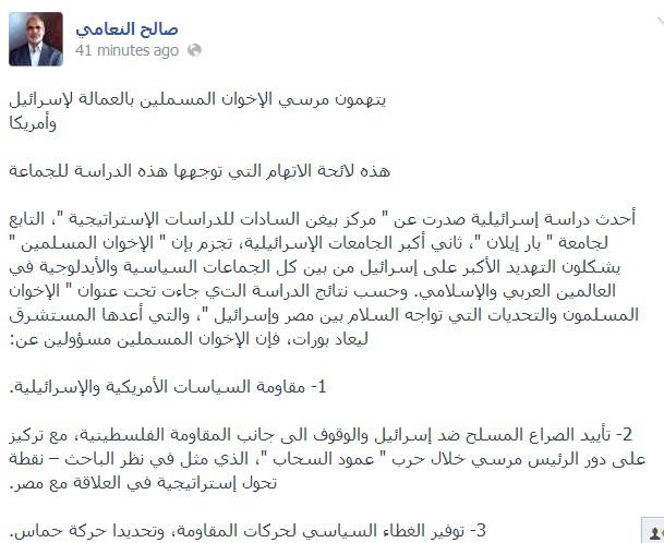 ذكر الأكاديمي الفلسطيني صالح النعامي المتخصص في الدراسات العبرية أن دراسة إسرائيلية حديثة تجزم بأن "الإخوان المسلمين" يشكلون التهديد الأكبر على أمن إسرائيل من بين كل الجماعات السياسية والأيدلوجية في العالمين العربي والإسلامي.