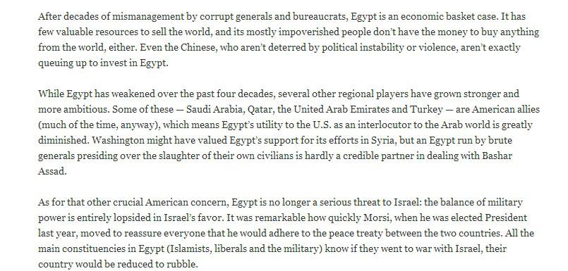 قالت مجلة تايم الأمريكية" " إن مصر لم تعد تمثل تهديدا خطيرا على إسرائيل حيث أن كفة ميزان القوة العسكرية تميل تماما لصالح إسرائيل، وكان لافتا كيف أسرع مرسي بعد انتخابه رئيسا العام الماضي إلى إرسال رسالة طمأنة بالالتزام بمعاهدة كامب ديفيد بين الدولتين. كل القوى الأساسية في مصر من إسلاميين وعسكريين وجيش يعلمون إنه في حالة خوض حرب ضد إسرائيل، ستتحول مصر إلى أنقاض".