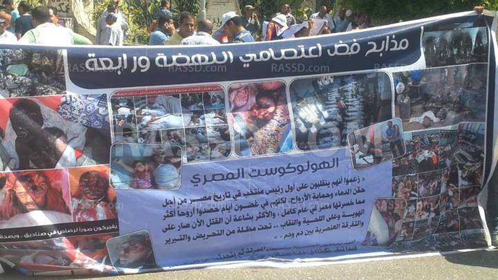 وردد المتظاهرون هتافات مثل "ياشهيد نام و ارتاح واحنا نكمل الكفاح"، "الموت فى سبيل الله أسمى امانينا"، رافعين لاقتة كبيرة مكتوب عليها مذابح فض اعتصامي النهضة، ورابعة الهولوكست المصري.