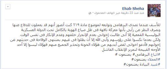 وقال شيحة على حسابه الشخصي على موقع التواصل الاجتماعي " فيس بوك" : "للأسف عندما تصدى البرهامى وتوابعه لموضوع مادة ٢١٩ كنت أتصور أنهم قد يعملون للدفاع عنها وبصرف النظر عن رأيى بأنها معركة تافهة فى ظل ضياع الهوية بالكامل تحت الدولة العسكرية البوليسية القمعية إلا أنى طالبت إخوانى بعدم الإنجرار خلفهم وعدم الإنكار فى نفس الوقت".
