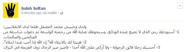 وجه الداعية الإسلامي الدكتورصلاح سلطان رسالة عبر موقع التواصل الاجتماعي فيسبوك اليوم الاثنين رسالة إلى نجله محمد الذي اعتقلته السلطات الأمنية أمس الأحد، طالبه فيها بالتحلي بصبر الرجال ذوي العزيمة في النزال، مشيرا إلى أن الله إذا أحب عبدا ابتلاه.
