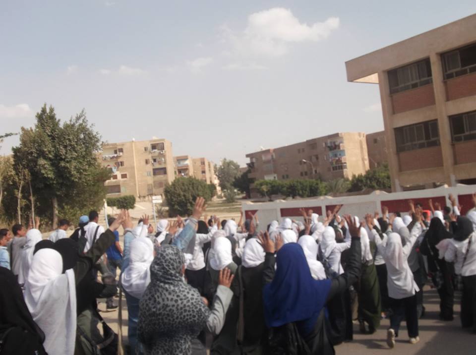 وقد قوبلت المسيرة بسيارة وأفراد الشرطة لتفريق الطلاب المتظاهرين وطاردتهم داخل شوارع محلية (٨) في مدينة العبور.