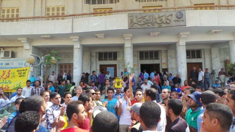 حيث احتشد المئات من الطلاب المؤيدين للشرعية والمنددين بالانقلاب العسكرى وما آلت اليه احوال البلاد وبالاخص حال الجامعة التى أصبح حرمها ماهو الا ساحة حرب واعتقال على حد قولهم تعليقا على قرار منح الضبطية القضائية بالجامعات ..