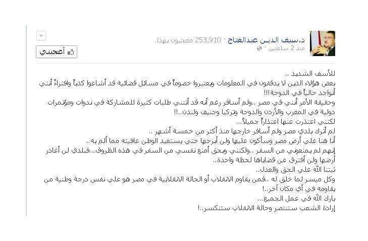نفى د. سيف الدين عبد الفتاح ما تردد حول سفره للدوحة مشيرًا أنه جاءت له دعوات فر للمشاركة في ندوات في في المغرب والأردن والدوحة وتركيا وجنيف ولندن ولكنه اعتذر عنها .