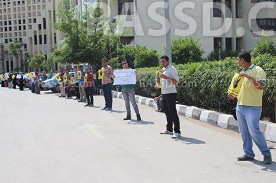 نظم طلاب كلية الصيدلة بجامعة المنصورة صباح اليوم الخميس سلسة بشرية بمدخل الكلية تضامناً مع زملائهم المعتقلين بالكلية وبالجامعة، وللمطالبة بالإفراج عنهم، وإسقاط الانقلاب العسكري.