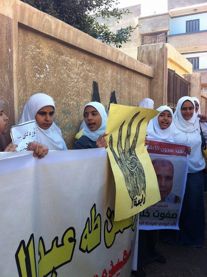ورفعو لافتات وصورة شهيد سجون الإنقلاب (د/صفوت خليل)حيث انه محبوب لدي أهل القريه وصورة شهيد الشباب (عبدالرحمن طه عبدالرحمن )حيث انه من أبناء القريه الذي استشهد في مجزرة رابعه العدويه ورفعو شعارات رابعه الصمود.