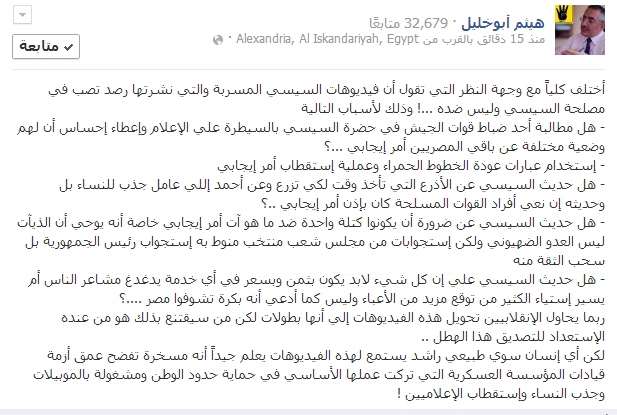 وتسائل أبو خليل في تدوين له علي صفحته علي موقع "الفيسبوك" اليوم (الخميس):- هل مطالبة أحد ضباط قوات الجيش في حضرة السيسي بالسيطرة علي الإعلام وإعطاء إحساس أن لهم وضعية مختلفة عن باقي المصريين أمر إيجابي ؟ استخدام عبارات عودة الخطوط الحمراء وعملية إستقطاب أمر إيجابي ؟ هل حديث السيسي عن الأذرع التي تأخذ وقت لكي تزرع وعن أحمد إلي عامل جذب للنساء بل وحديثه إن نعي أفراد القوات المسلحة كان بإذن أمر إيجابي ؟