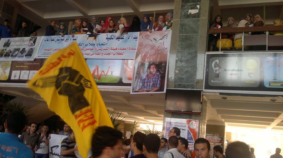 ورفع الطلاب شعار رابعة العدوية وصور الشهداء والمعتقلين ولافتات تندد بالانقلاب الدموى.