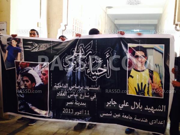 وتظاهر صباح اليوم تظاهر طلاب ضد الانقلاب بكلية الهندسة جامعة عين شمس ردا على مقتل الشهيد بلال علي جابر ،الطالب بكلية الهندسة.