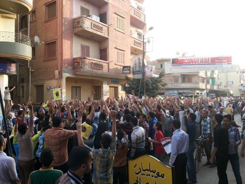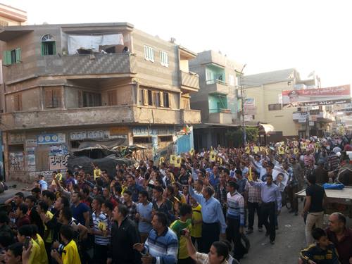 ورفع المتظاهرون صور الرئيس محمد مرسي وشهداء المنزلة خالد سويلم وأحمد البلقا وأعلام رابعة وطافت شوارع السينما ووسط البندر والثانوية.