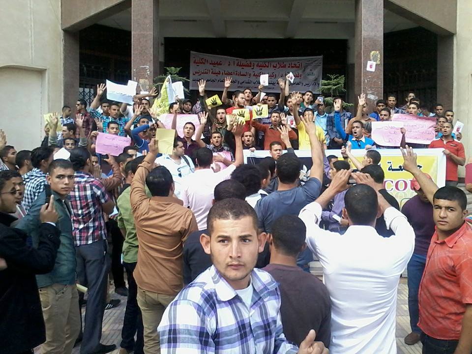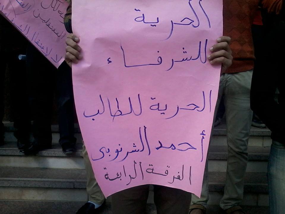 و طالب الطلاب بالإفراج عن زملائهم " أحمد الشرنوبي – الفرقة الرابعة " " أحمد العقاد – الفرقة الأولي " و عن جميع المعتقلين في سجون الإنقلابيين .