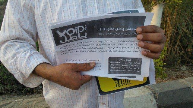 ورفع المشاركون لافتات كتب عليها عبارات رافضة للانقلاب العسكرى منها يسقط يسقط حكم العسكر ، يانعيش سعداء يانموت شهداء ، سلميتنا أقوى من الرصاص ، كما قاموا بالتوقيع على استمارة باطل لرفض الانقلاب ورفعوا أعلام مصر ورمز الصمود رابعة وصور شهداء الشرعية وسط مشاركة فعالة لحركتى عفاريت وشباب ضد الانقلاب