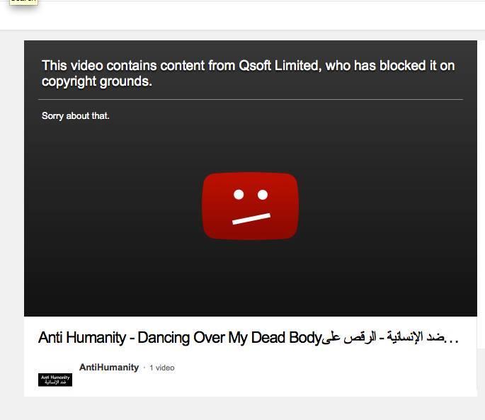 فوجيء العديد من مستخدمي موقع يوتيوب بحذف الفيديو المثير للجدل: ضد الإنسانية – الرقص على جثتي من الموقع، بعد أن قامت شركة "q soft" أحد أكبر شركاء موقع يوتيوب في الشرق الأوسط وشمال إفريقيا – و من ملاكها طارق القزاز و أسامة يوسف – ، والمنتجة لبرنامج "البرنامج" الذي يقدمه الإعلامي باسم يوسف، بالاعتراض على الفيديو نظراً لوجود جزء من حلقة البرنامج في الفيديو. وهو ما اعتبرته الشركة تعدياً على حقوق ملكيتها .
