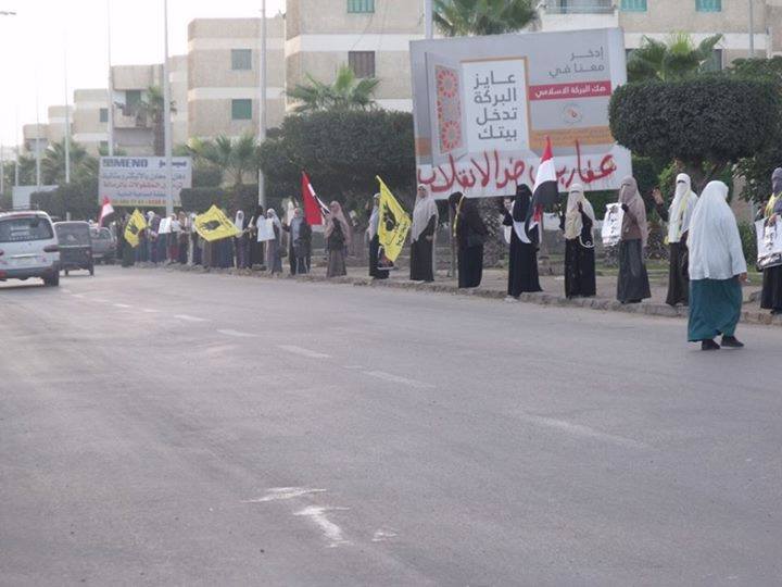 ورفع المشاركون إشارات رابعة العدوية، وصوراً للرئيس المنتخب محمد مرسي، وصوراً للفتيات السجينات، وسط هتافات مناهضة للانقلاب ولداخليته، وسط تفاعل كبير من المارة وسائقي السيارات.
