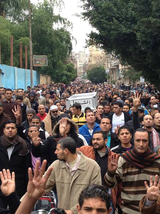 ورفع المشاركون فى الجنازة شارة رابعة العدوية مرددين هتافات ضد حكم العسكر وقوات داخلية الانقلاب وطالب المشيعون بالقصاص لدماء الشهداء ومحاكمة من قتلوة.