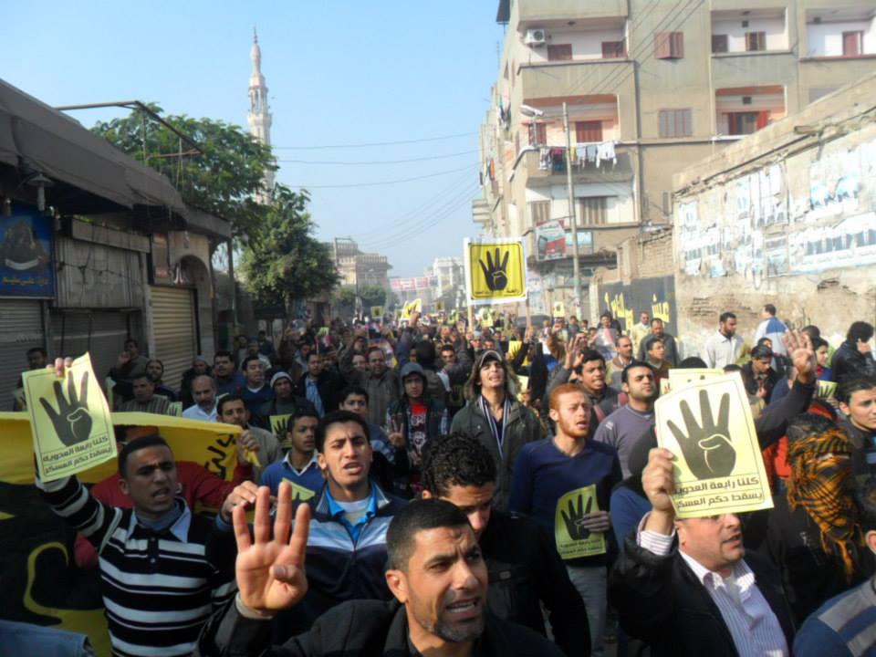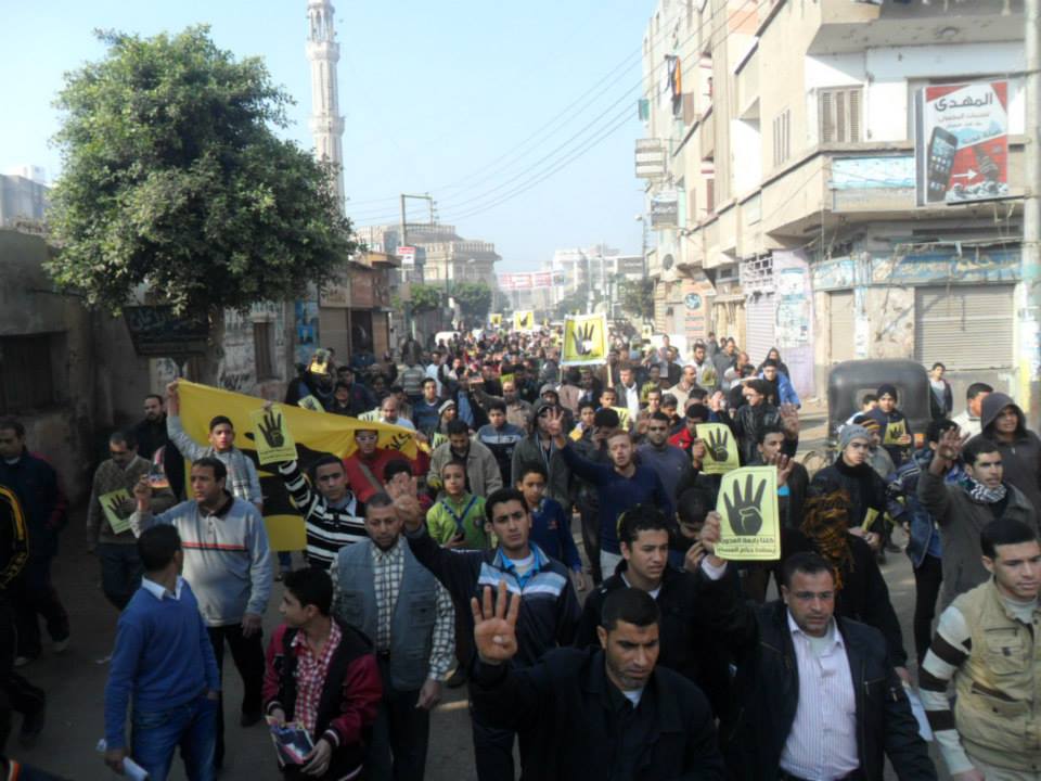 ورفع المشاركون شارات رابعة العدوية ولافتات للشهداء والمعتقلين وررد المشاركون هتافا "ياللى بتسأل اية القصة قتلوا اخويا وحرقوا الجثة " "يسقط يسقط حكم العسكر " "هنقاطع الدستور " وطافت المسيرة معظم شوارع المدينة .