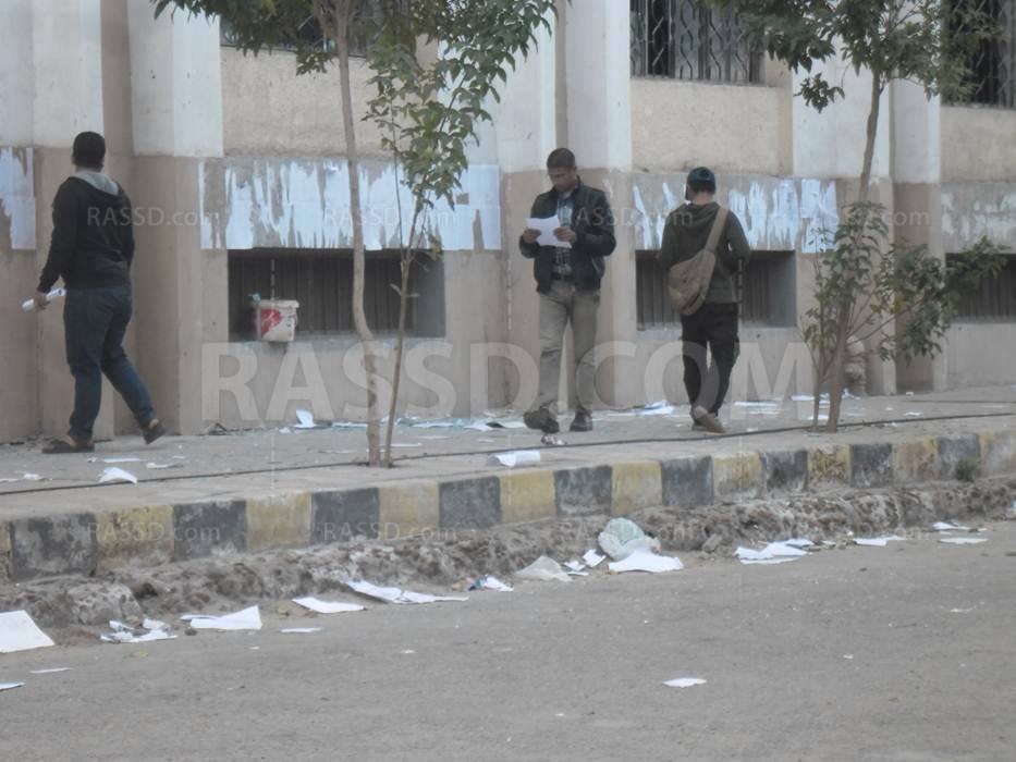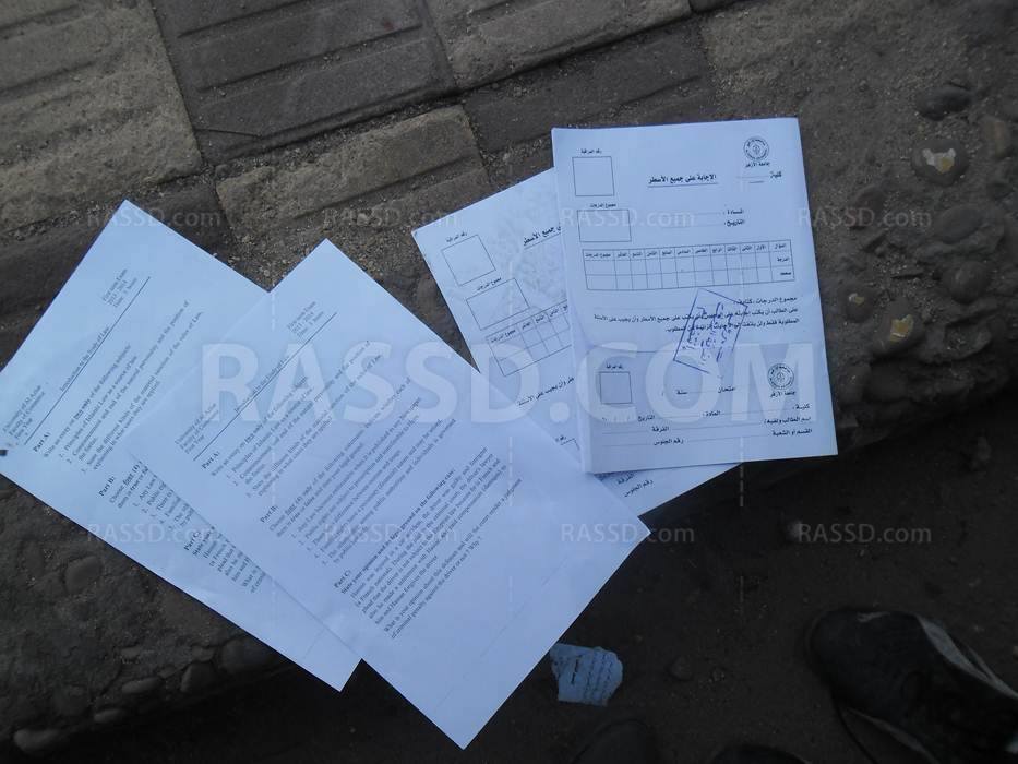 ألقى طلاب كلية التجارة إنجليزى بالفرقة الأولى أوراق الأسئلة والإمتحانات من النوافذ، مصرين على إضرابهم عن الإمتحانات حتى القصاص لزملائهم، حيث كان من المقرر عليهم امتحان مادة القانون باللغة الإنجليزية.