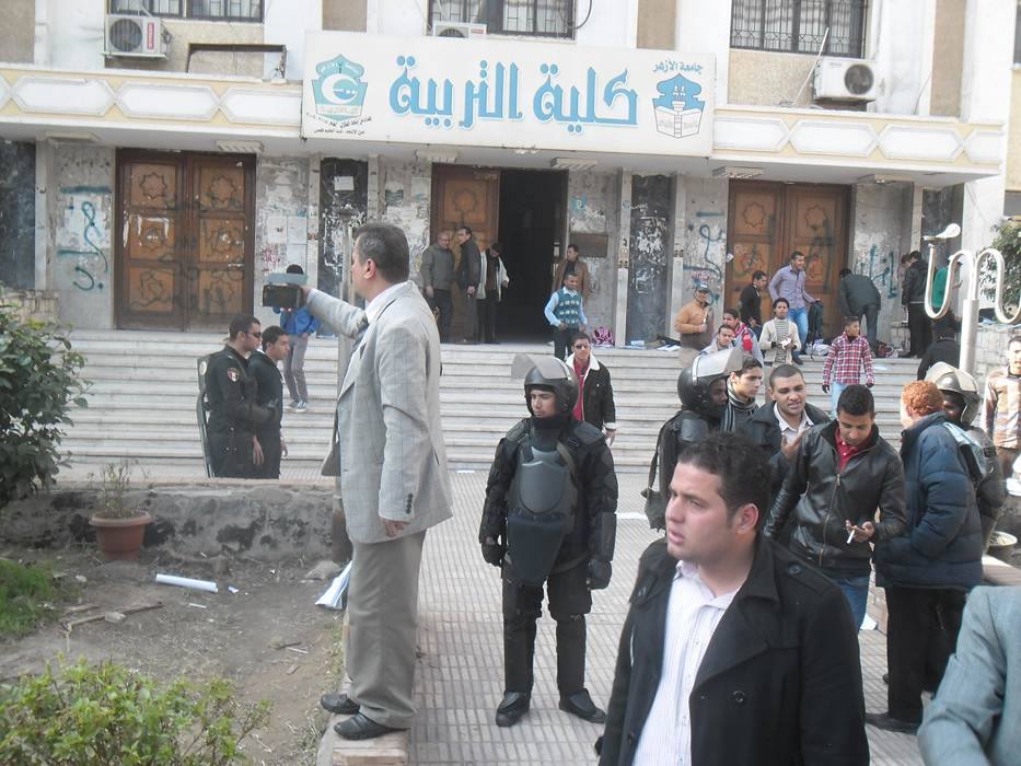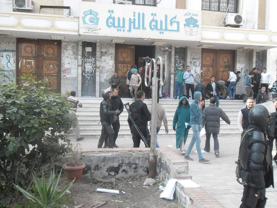 دخل عدد من طلاب الفرقة الاولى والثانية بكلية التربية جامعة الأزهر الى الامتحان صباح اليوم الأثنين بعد أن حاولوا عمل اضراب عن الامتحان وهاجمتهم قوات الأمن ودخلوا الكلية مما اضطر الطلاب الى دخول الامتحان خوفا من بطش الأمن.