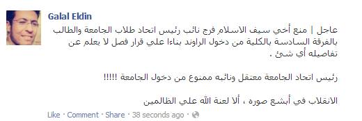 واستنكر جلال الدين محمود أمين اتحاد طب المنصورة عبر صفحته الشخصية على موقع التواصل الإجتماعى " فيس بوك " منع سيف الإسلام من دخول الكلية قائلا : "رئيس اتحاد الجامعة معتقل ونائبه ممنوع من دخول الجامعة الانقلاب في أبشع صوره ، ألا لعنة الله علي الظالمين " .