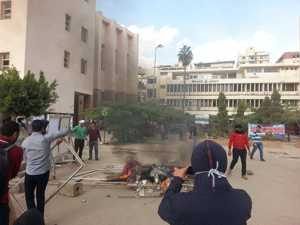 أحرق طلاب جامعة المنصورة مدرعة حاولت الإعتداء عليهم داخل الحرم الجامعى ،وتزايد إطلاق قنابل الغاز المسيل من قبل قوات داخلية الإنقلاب ،واقتحام الداخلية لوسط الجامعة .