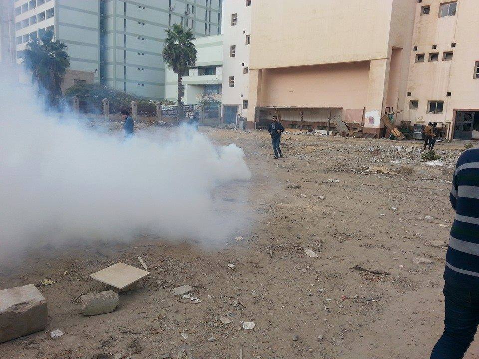 الطلاب يحرقون مدرعة بجامعة المنصورة مع إطلاق غاز كثيف