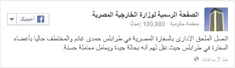 وقالت الوزارة على صفحتها الرسمية عبر موقع التواصل الاجتماعي – فيس بوك – "اتصل الملحق الادارى بالسفارة المصرية في طرابلس حمدي غانم والمختطف حاليا بأعضاء السفارة في طرابلس حيث نقل لهم أنه بحالة جيدة ويعامل معاملة حسنة."